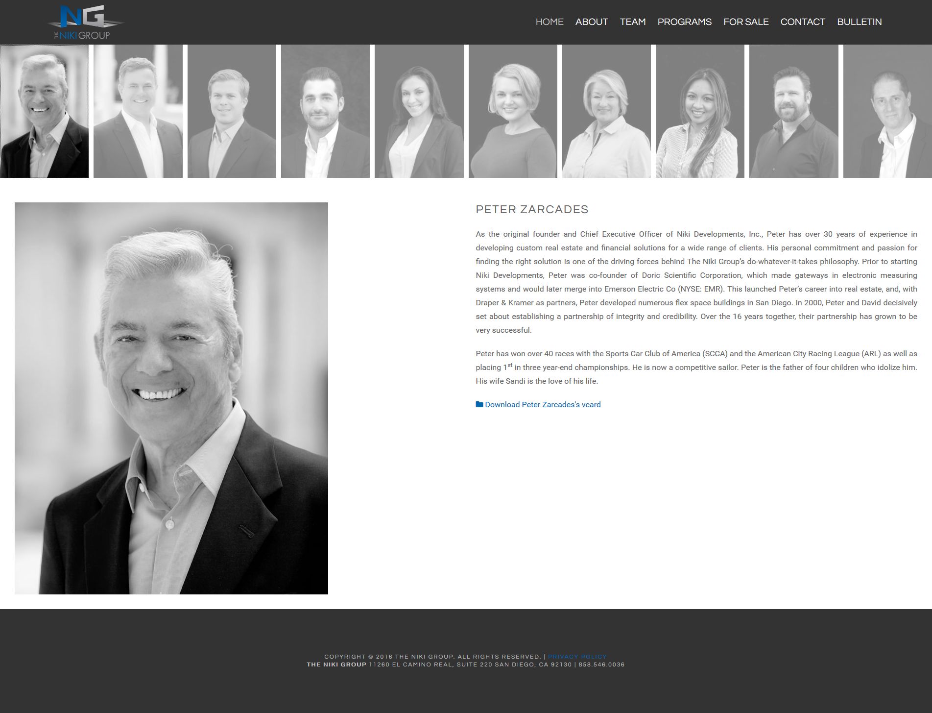 The website features a dynamic real estate investment portfolio tool that allows staff at The Niki Group to add, edit and remove properties and investments as required. One of our favorite features on the site is the "Team" page where each team member's picture is displayed along the top as selectable items that display the appropriate text content when clicked.